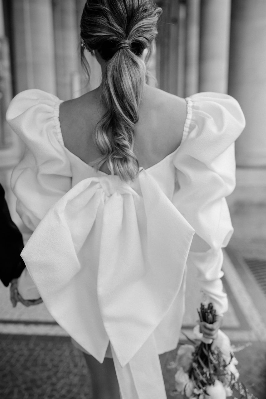 For the actual service day, wear a button-down, zip-up shirt, or a bridal robe. For previews, wear something that mirrors your wedding dress's neckline, ideally with a white top.